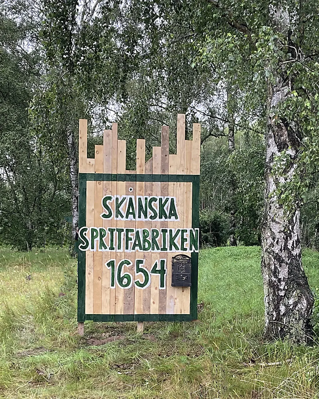 · Fortsätt rakt fram. Var uppmärksam på vänster sida där en stor skylt markerar Skånska Spritfabriken vid adressen Sandby 1654.